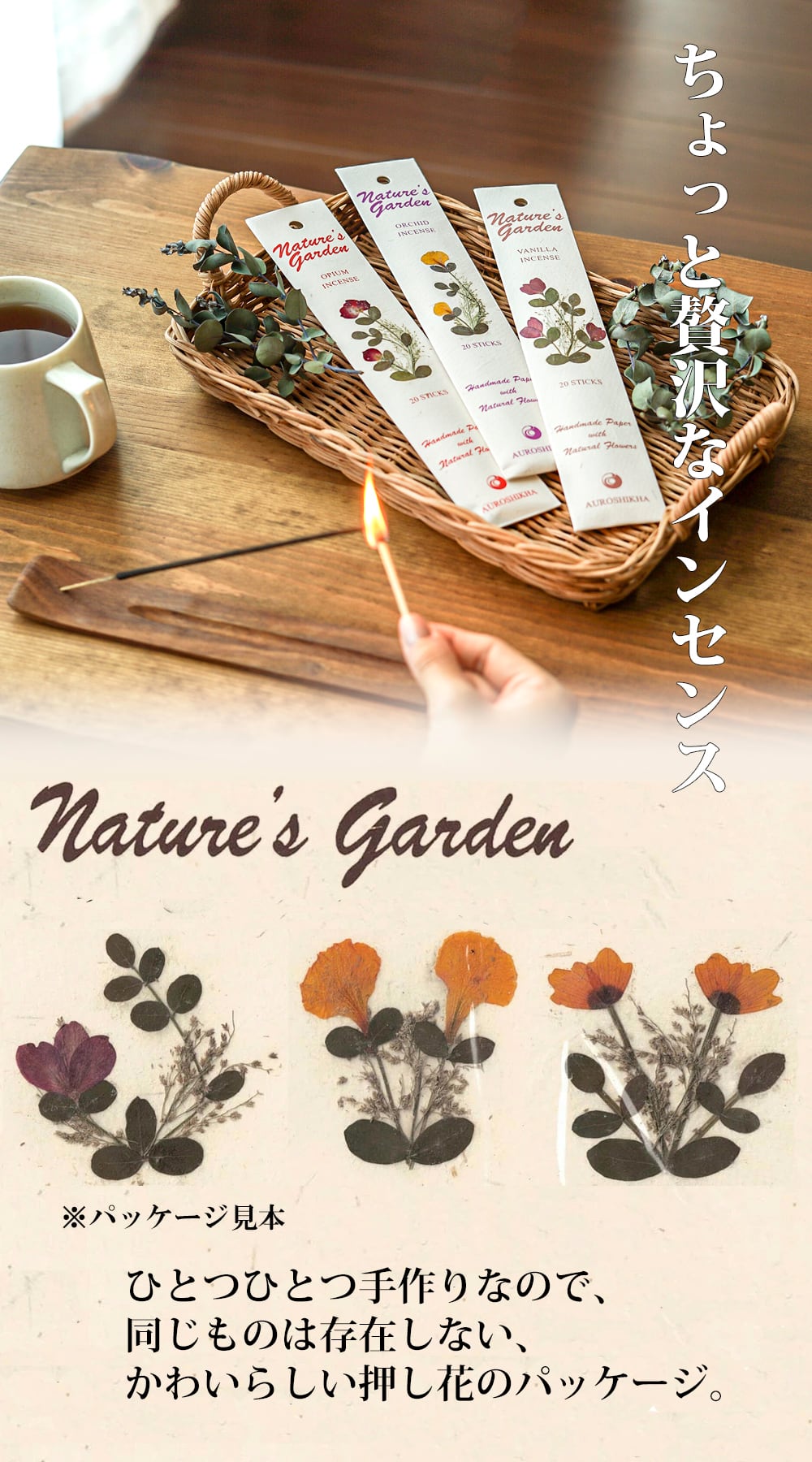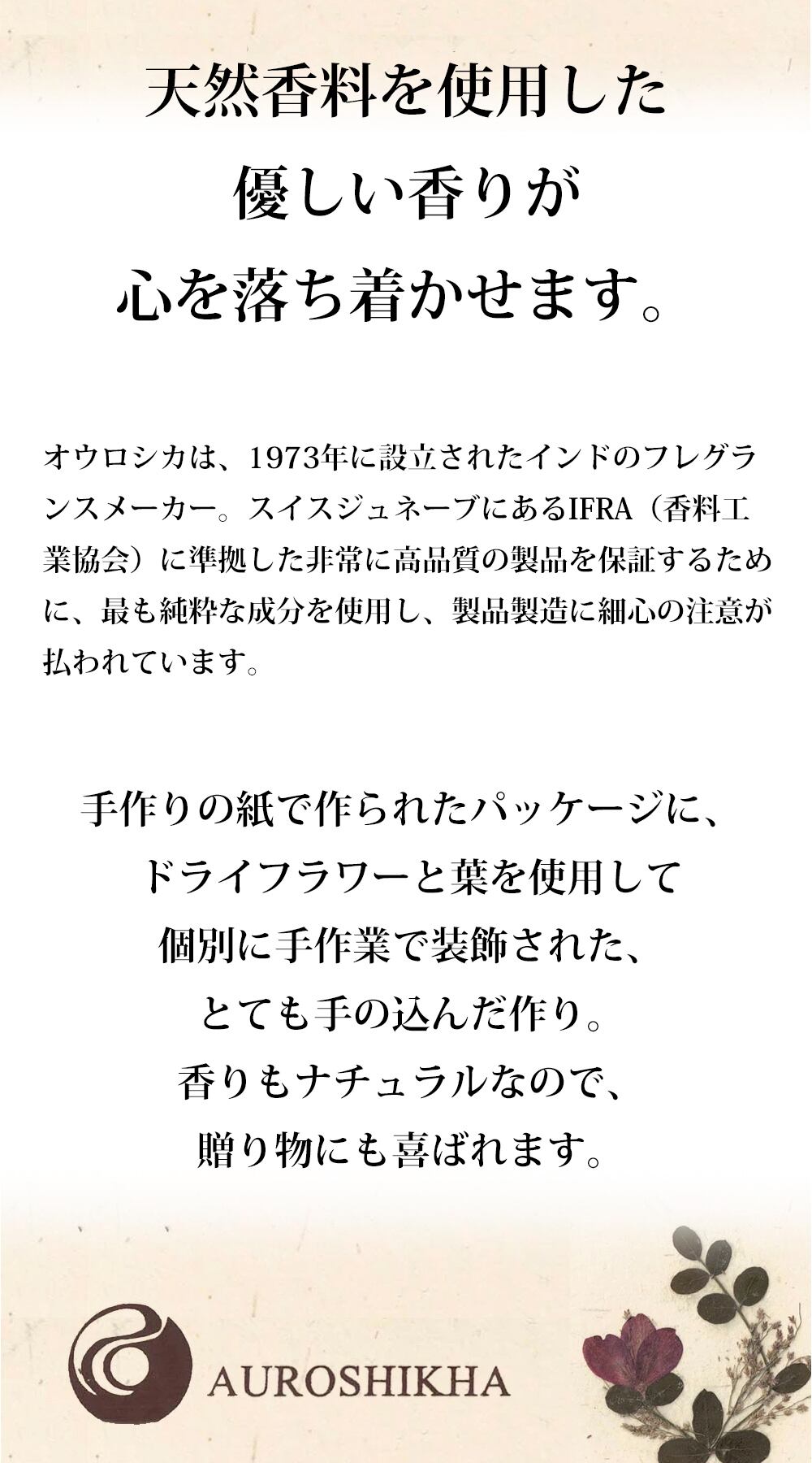 天然香料を使用した優しい香りが心を落ち着かせます。体にも環境にも良いワンランク上の高級インセンス。